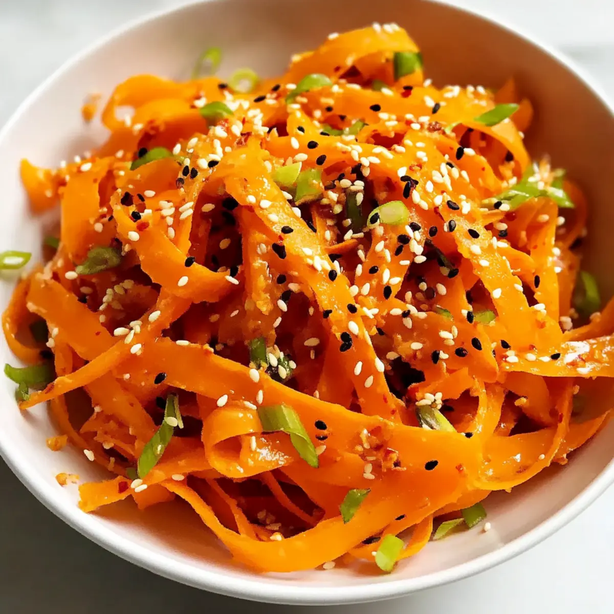 This Asian Raw Carrot Salad is a fantastic option for meal prep, allowing you to streamline your mealtime routine. You can prepare the carrot ribbons and store them in an airtight container up to 3 days in advance, keeping them crisp and ready to toss. The dressing can also be made ahead of time—just whisk together the soy sauce, rice vinegar, and sweetener, and refrigerate it for up to 24 hours. When you’re ready to serve, simply dress the carrots and toss them with the dressing, adding sesame seeds just before plating to maintain that delightful crunch. By following these steps, you can ensure your salad remains as refreshing as if freshly made, perfect for busy weeknights or last-minute gatherings!