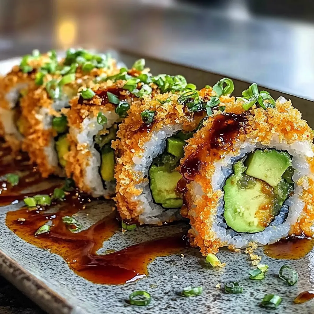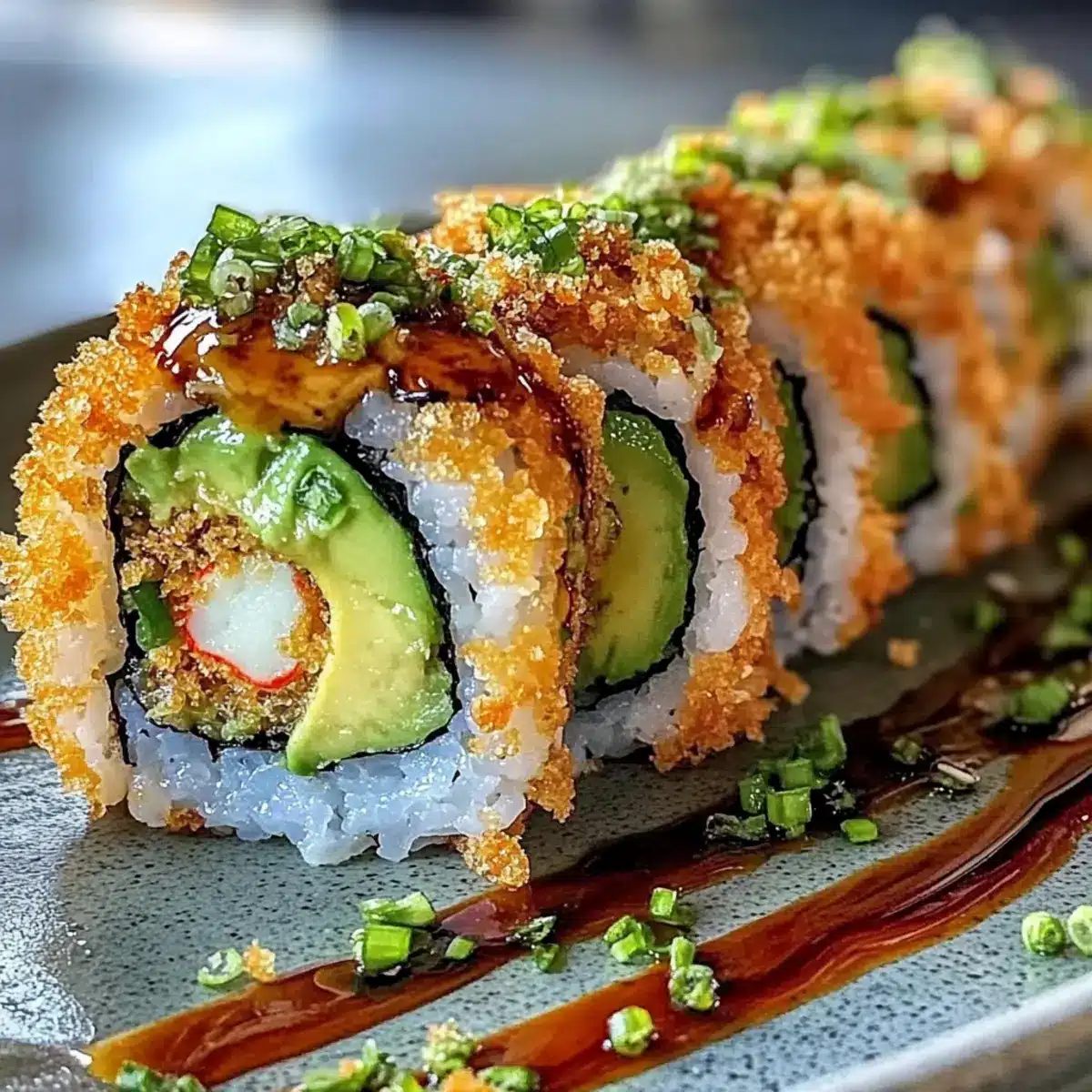 Crispy Delight: The crunchy tempura bits create a delightful texture that contrasts beautifully with the creamy avocado and spicy filling.