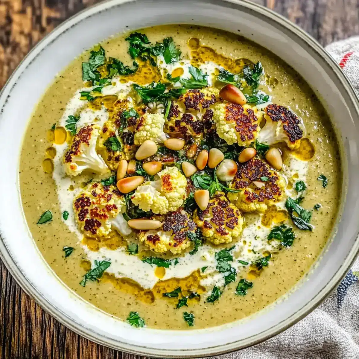 Ladle the soup into bowls while it’s still warm. Drizzle with a little olive oil and garnish with feta cheese, fresh herbs, or toasted pine nuts as desired. This flavorful Mediterranean cauliflower soup will be a comforting delight perfect for any occasion!