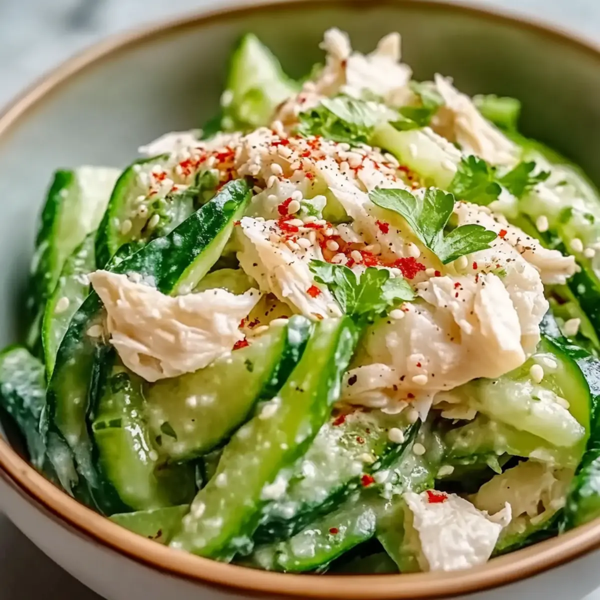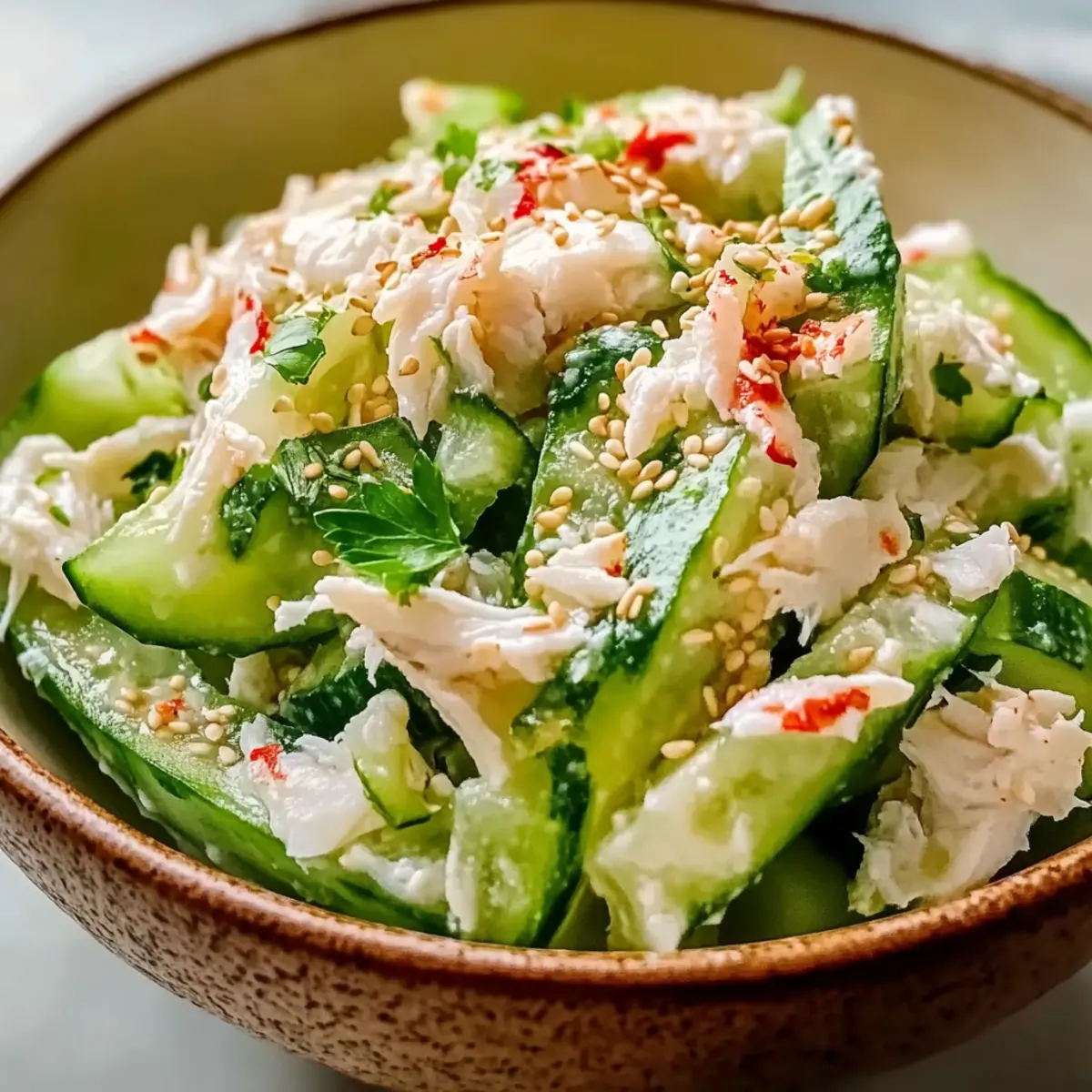 Once everything is combined, take a moment to plate your Cucumber Salad with Crab Meat. Transfer the salad to a serving dish and sprinkle sesame seeds or your choice of fresh herbs over the top for a beautiful finish. Serve this delightful salad cold, enhancing the refreshing flavors perfect for a light meal or side dish during warm weather. Enjoy the crisp, elegant dish with your loved ones!