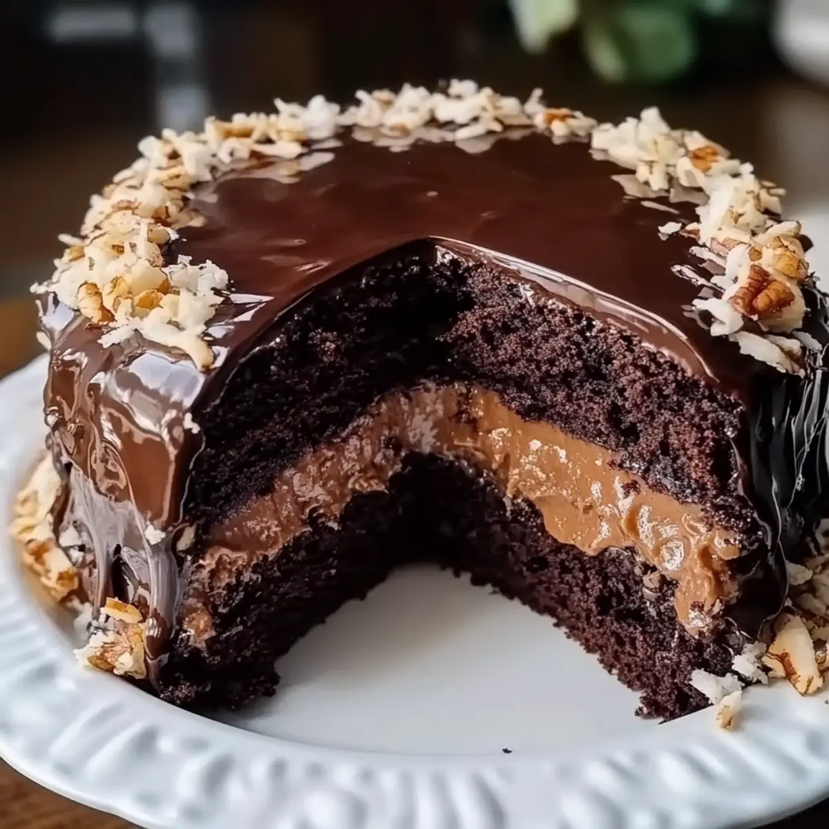 To assemble your irresistible German Chocolate Cake, place one chocolate layer on a serving plate. Spread a generous layer of the coconut-pecan filling on top, then add the second layer and repeat. Finish with the last layer and pour the ganache over the top, allowing it to drip down the sides.
