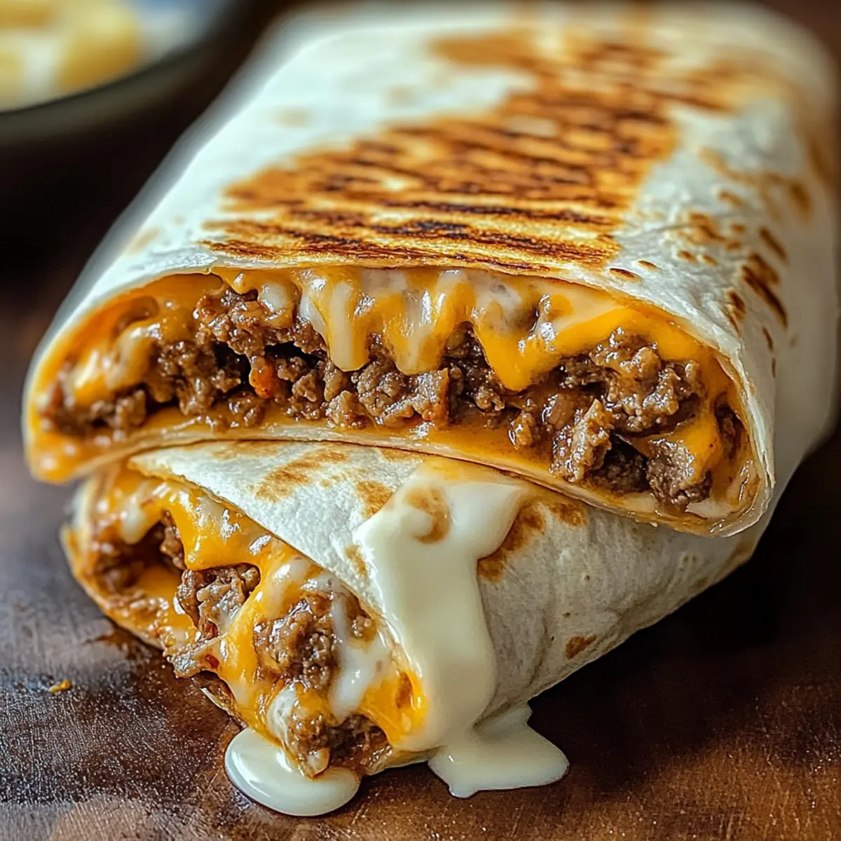 While the beef is simmering, prepare large flour tortillas to ensure they are pliable. You can warm them in a skillet for about 30 seconds on each side or use a microwave for 10–15 seconds. This will make it easier to fold and roll your Grilled Cheese Burrito without tearing the tortillas.