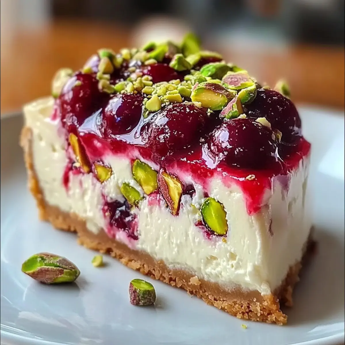 Eye-Catching Presentation: Topped with bright cherry filling and crunchy pistachios, this cheesecake isn’t just tasty—it’s a visual masterpiece that will impress your guests.