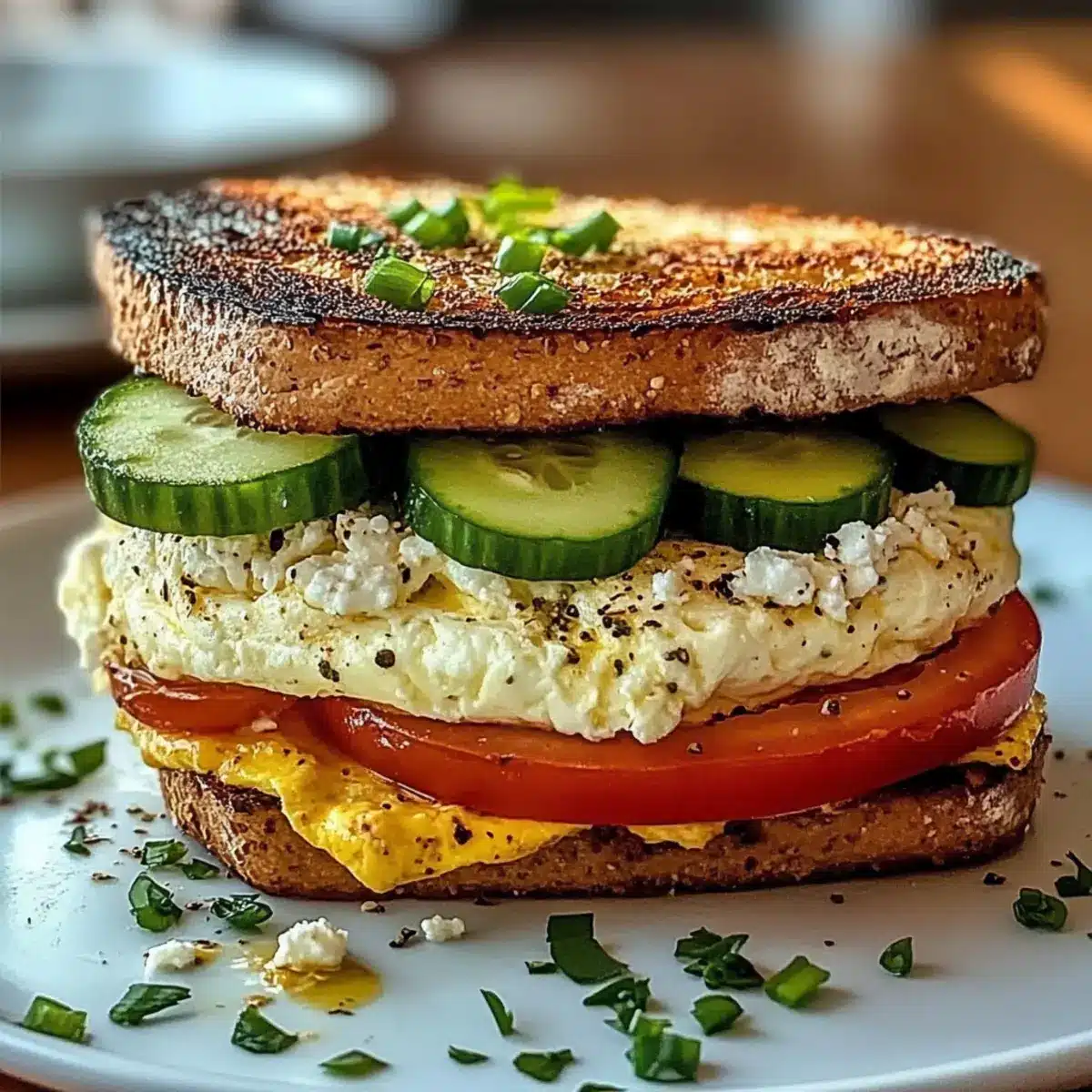 - Once your omelet is fully cooked, slide it onto a cutting board and slice it in half. Start by placing one slice of toasted bread on a plate, then layer on juicy tomato slices, followed by crunchy cucumber. Add the omelet on top and sprinkle with crumbled feta cheese.