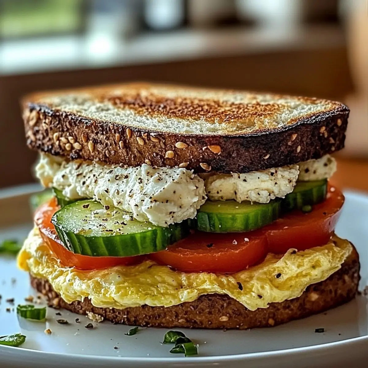 Finish your assembly by placing the second slice of toasted bread on top of the filling. To serve your Mediterranean Breakfast Sandwich, slice it in half diagonally to showcase the colorful layers. For an extra touch, you can garnish with fresh herbs for a burst of flavor and aesthetic appeal.