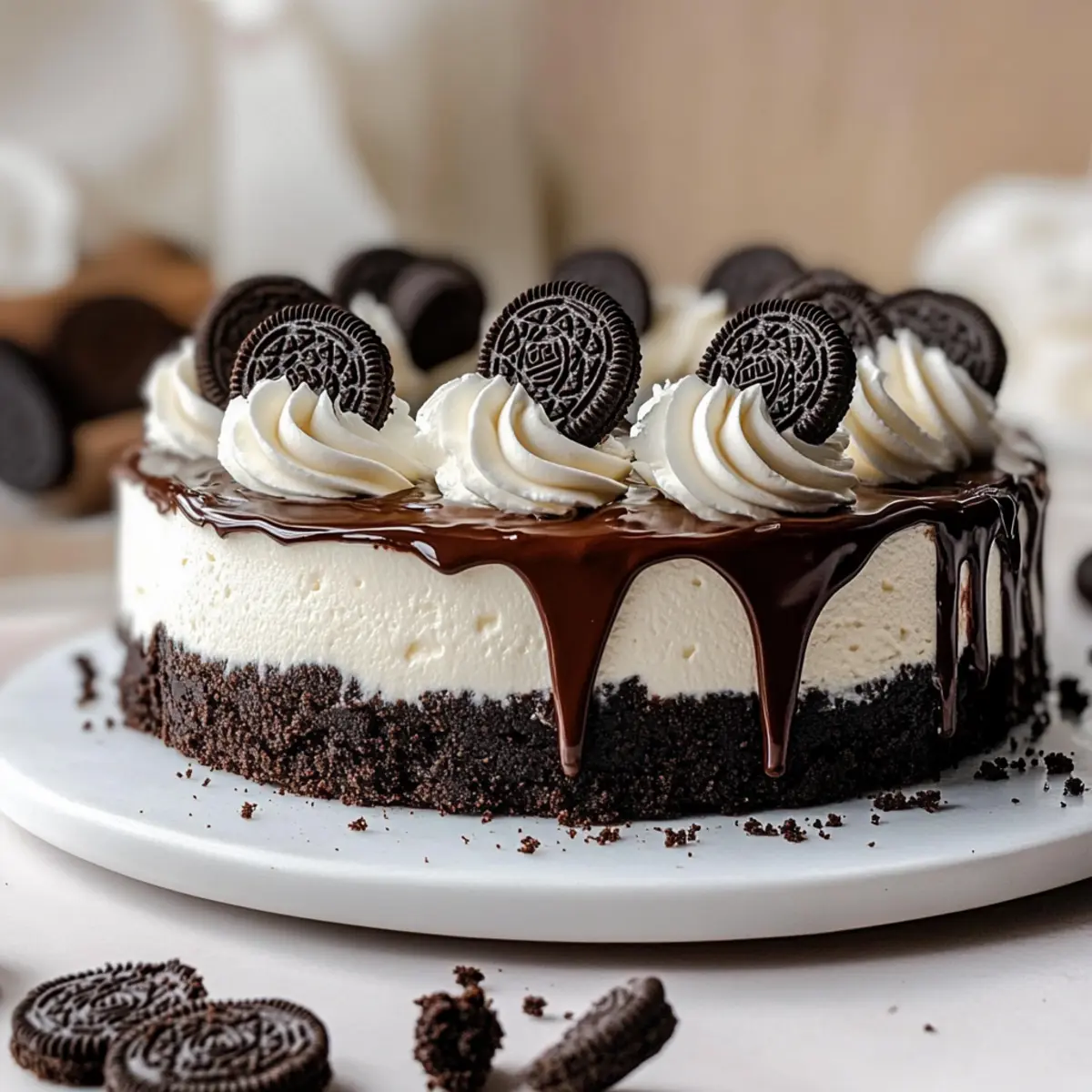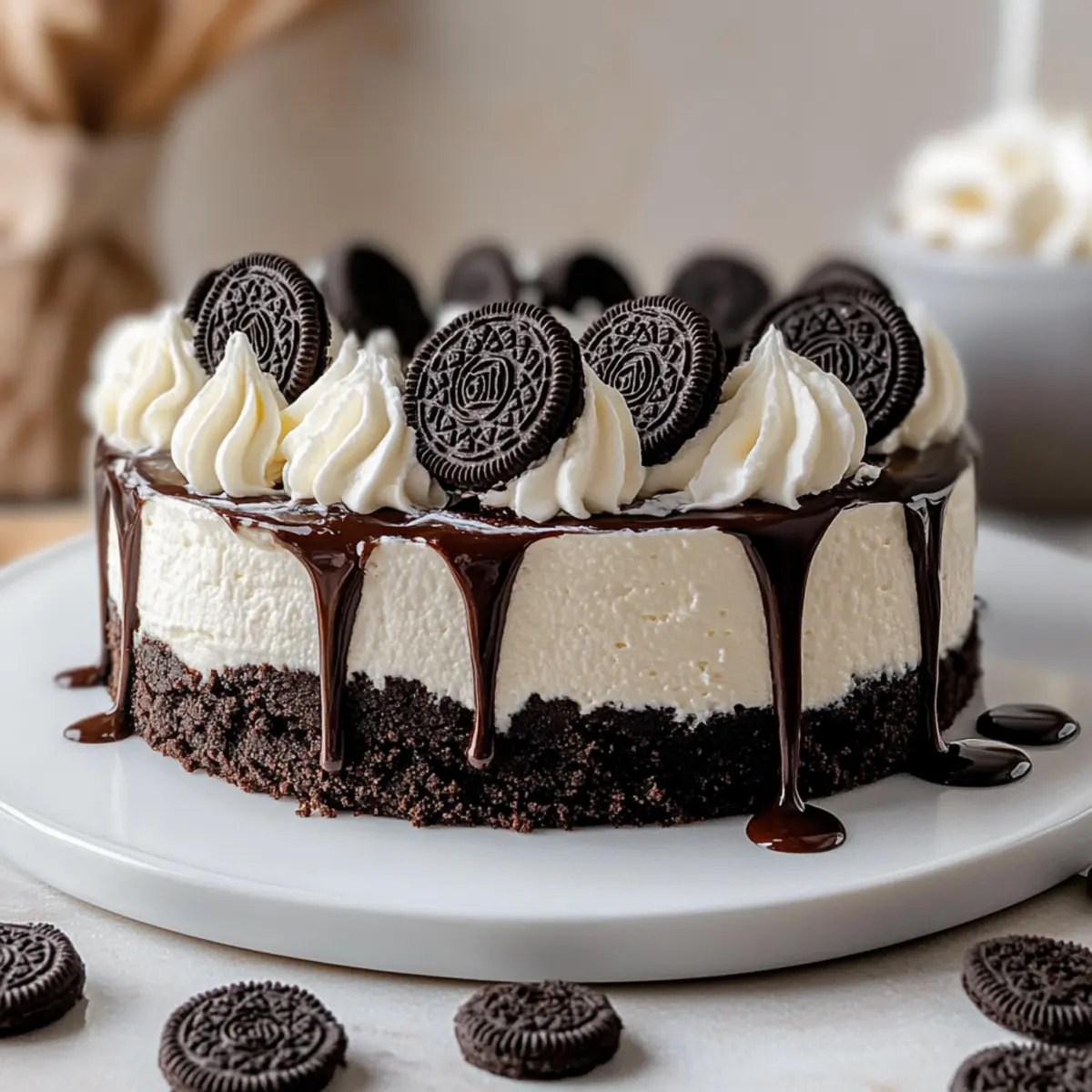 - Pour ganache over the set cheesecake and decorate with whipped cream and mini Oreos.