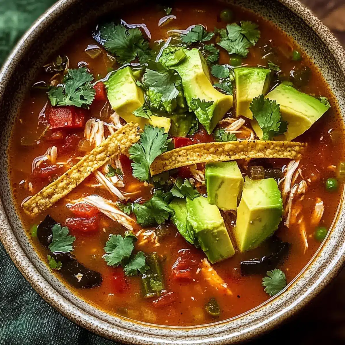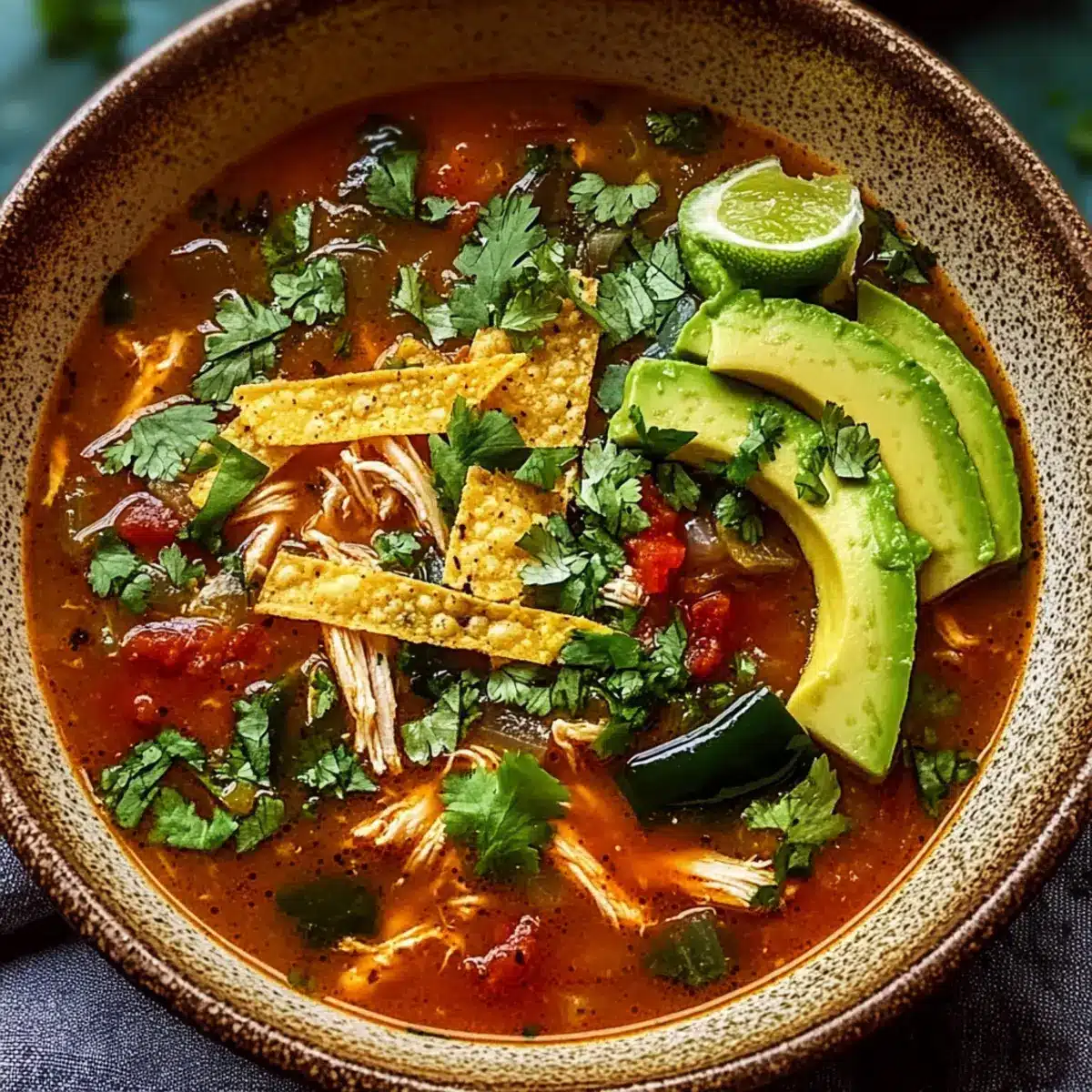 After the soup has simmered, stir in the juice of one lime and a handful of chopped fresh cilantro. Taste and adjust the seasoning if necessary. This brightening touch elevates your Poblano Chicken Tortilla Soup, bringing a burst of freshness that balances the rich flavors.