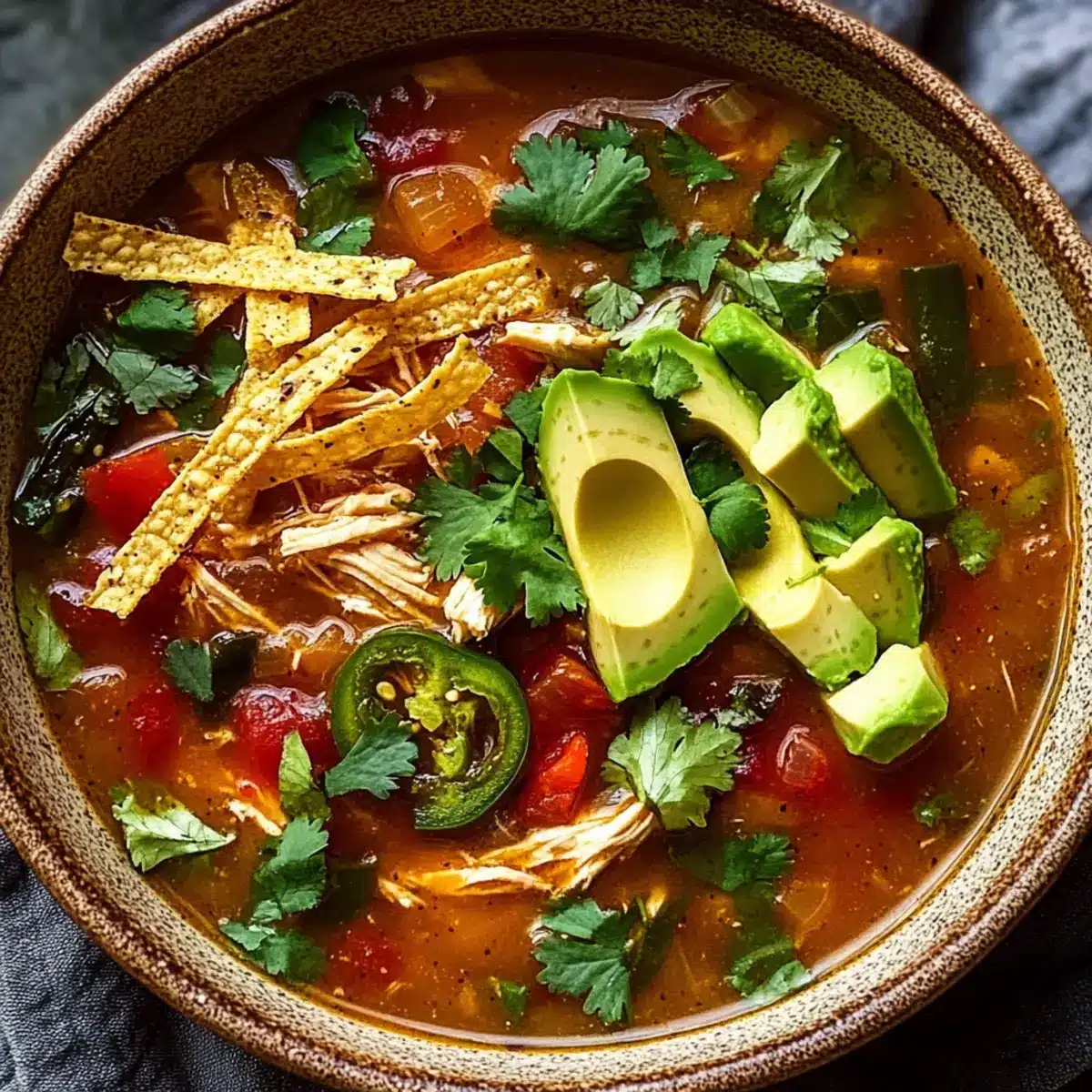 - Ladle soup into bowls, garnish with avocado slices, Monterey Jack cheese, crispy tortilla strips, and sour cream.