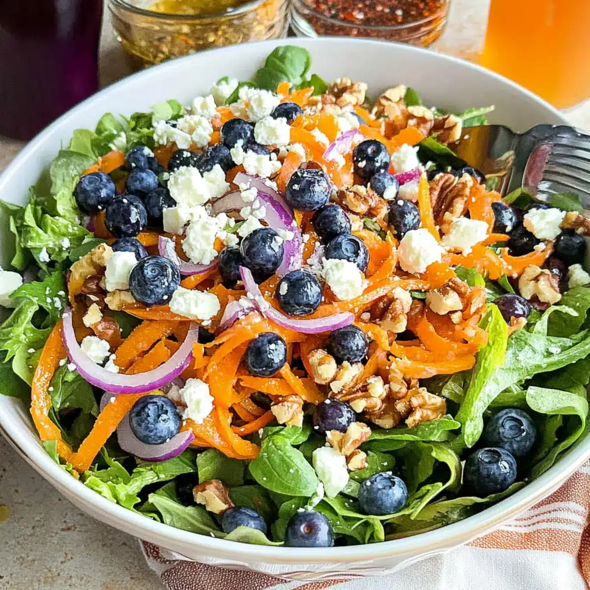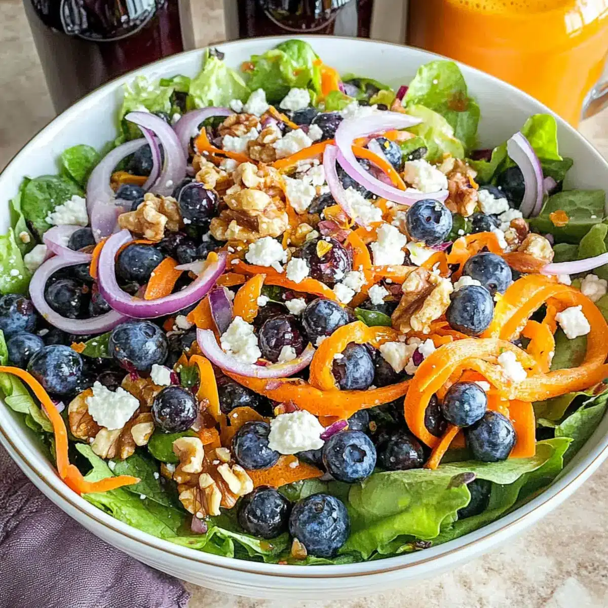 In a large mixing bowl, add the spring mix salad greens, shaved carrots, fresh blueberries, thinly sliced red onions, crumbled feta cheese, and coarsely chopped walnuts. Aim for a colorful presentation, as the vibrant hues will entice your guests. Toss these ingredients gently with clean hands or salad tongs to ensure everything is evenly distributed, creating a beautiful base for the salad.