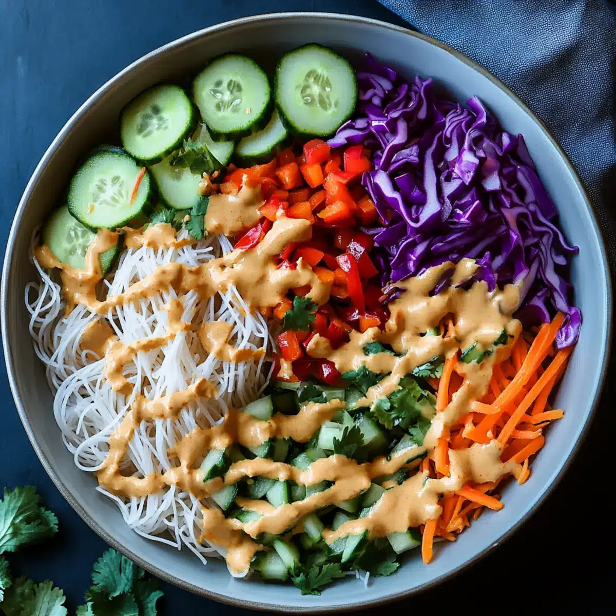 Drizzle the creamy peanut sauce over the mixed noodles and vegetables, using a spatula to evenly distribute the dressing. Toss everything thoroughly to ensure each bite is coated with that delicious peanut flavor. Watch the colors come alive as you blend the salad ingredients into a cohesive dish.