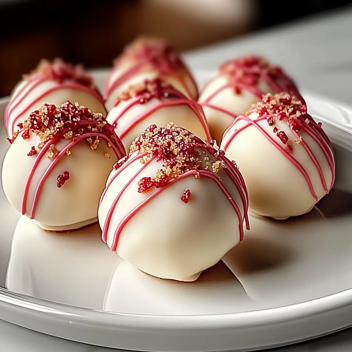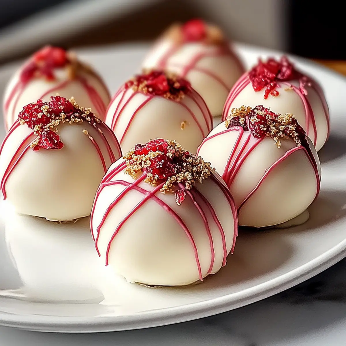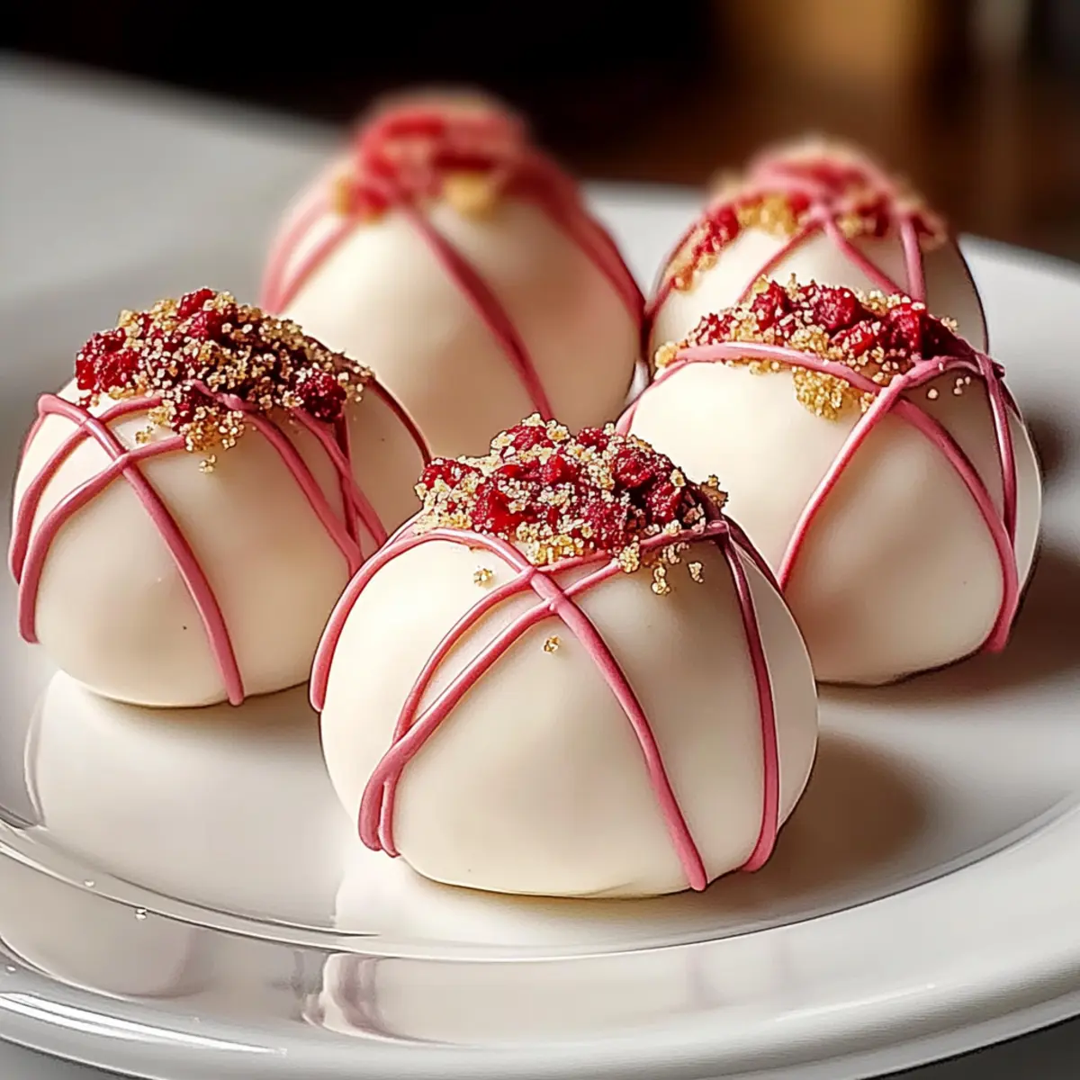 For an elegant touch, melt a bit more white chocolate and drizzle it over the coated truffles. Sprinkle crushed freeze-dried strawberries on top for added texture and a vibrant pop of color. Leave the truffles to set in the refrigerator for about 30 minutes, allowing them to firm up before serving. Enjoy your Strawberry Cheesecake Truffle Balls Bliss!