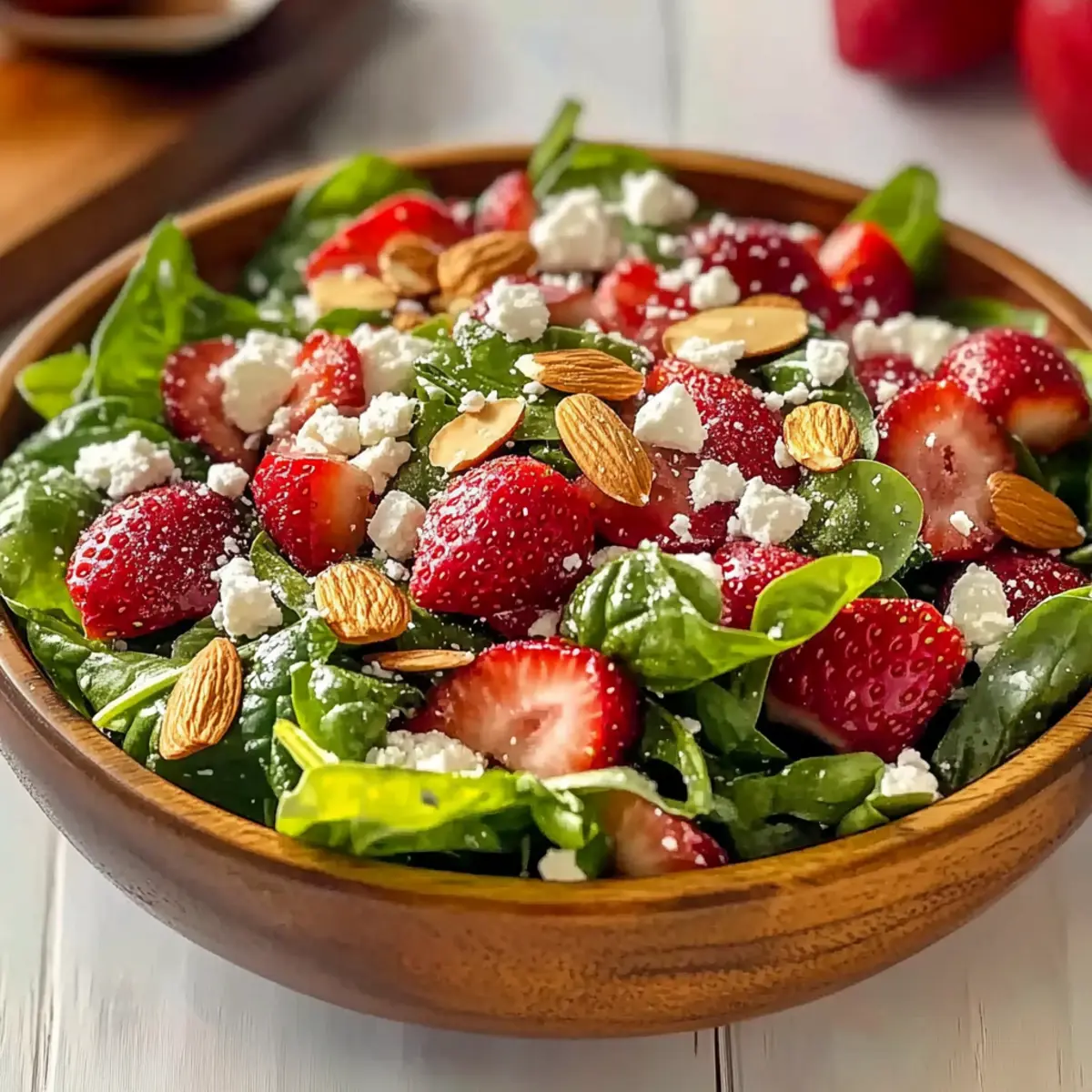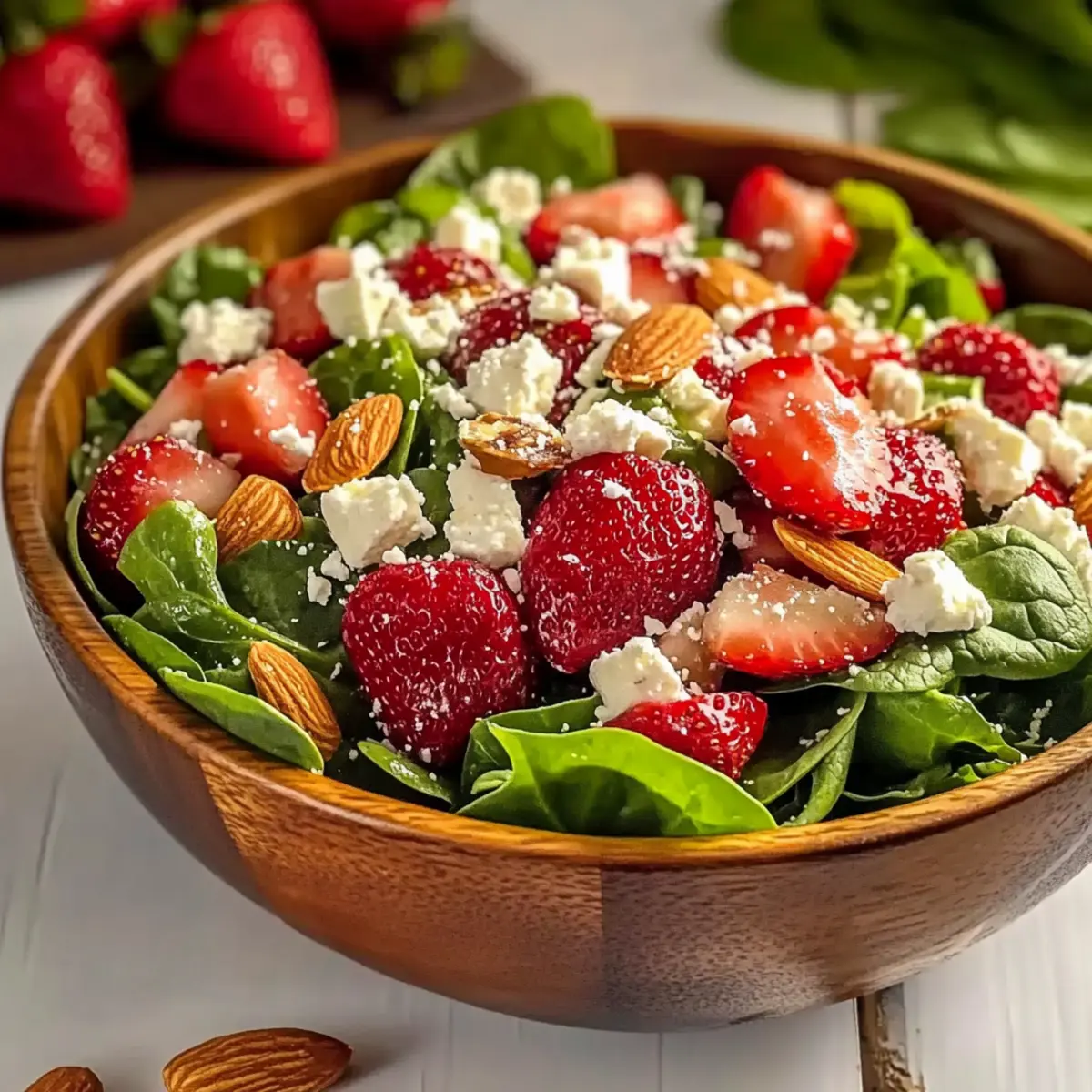 To keep your salad fresh for up to 3 days, store the salad components—greens, strawberries, nuts, and feta—separately in airtight containers in the fridge. Always keep the dressing in its own container to maintain the crispness of the greens.