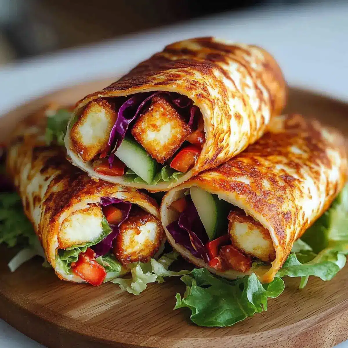 Take your tortilla wraps and lay them flat on a clean surface. Spread a generous layer of sweet chili sauce onto each wrap, allowing the flavors to permeate. Start layering with the crispy halloumi slices, followed by the beautifully sliced vegetables. If you’re adding optional toppings like avocado or herbs, sprinkle those on now to enhance the flavor profile of your Sweet Chili Halloumi Wraps.
