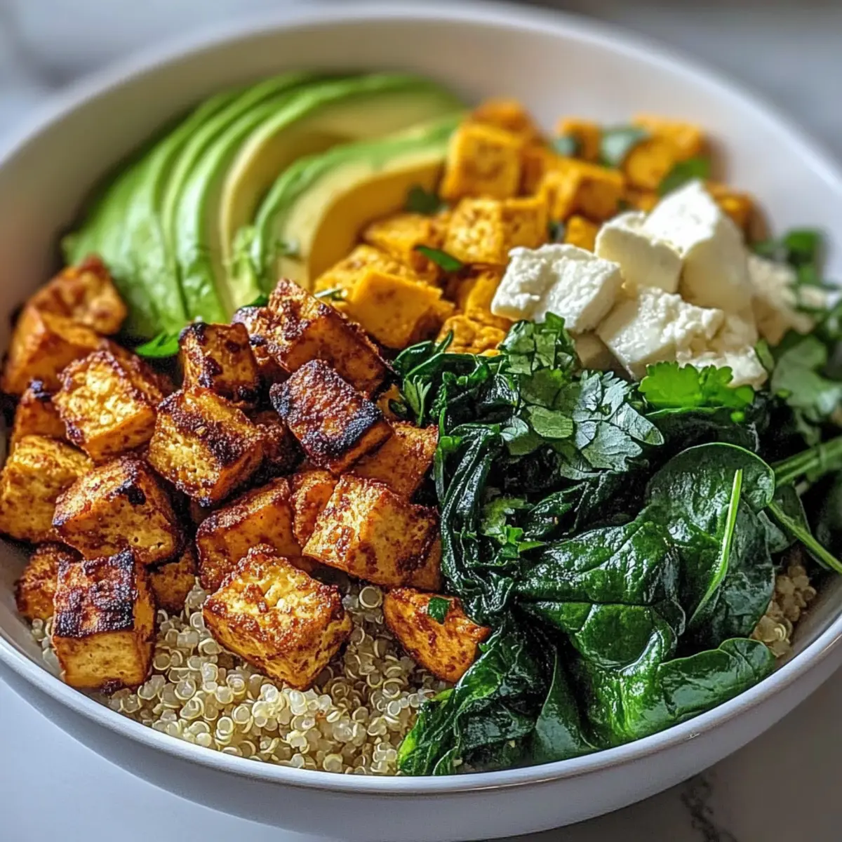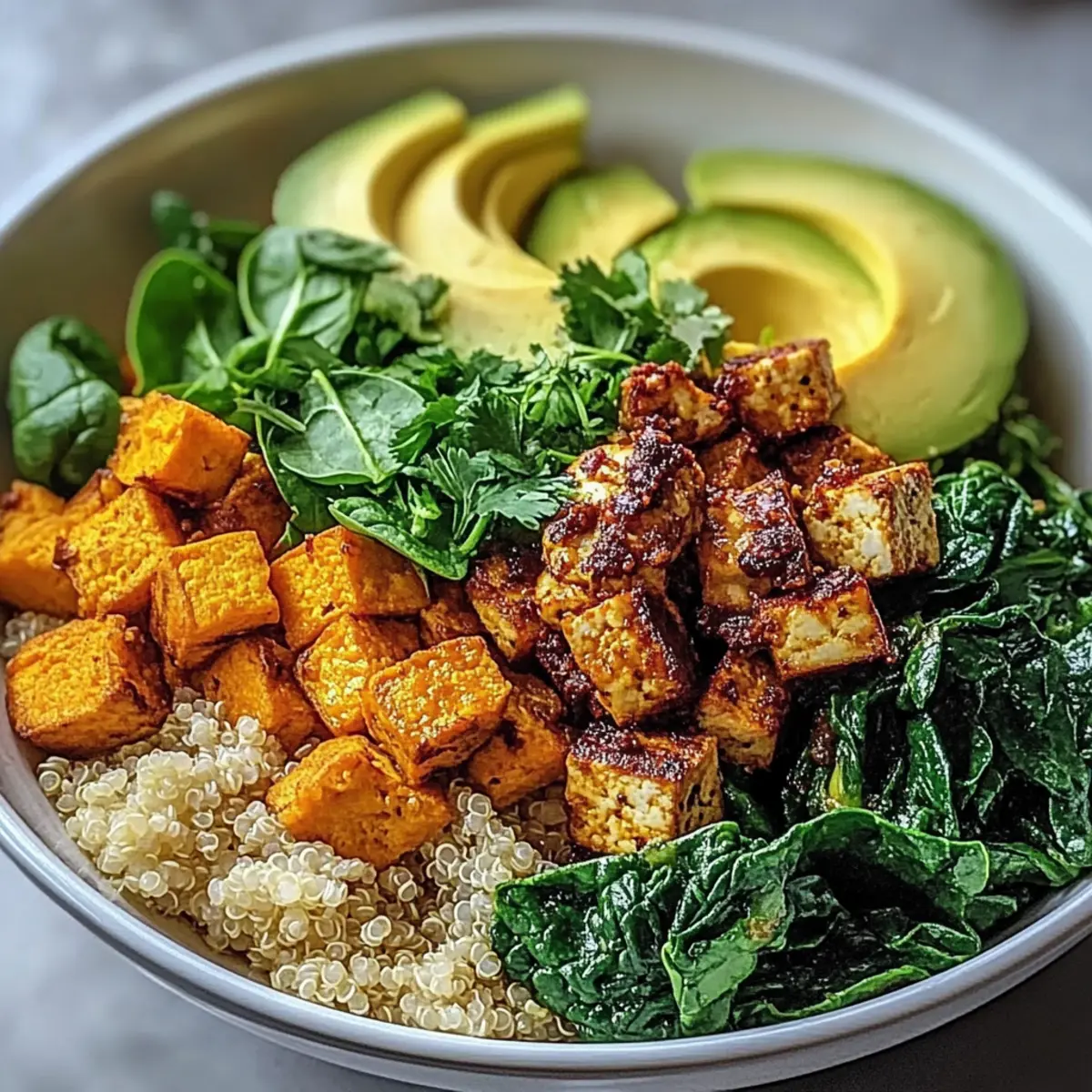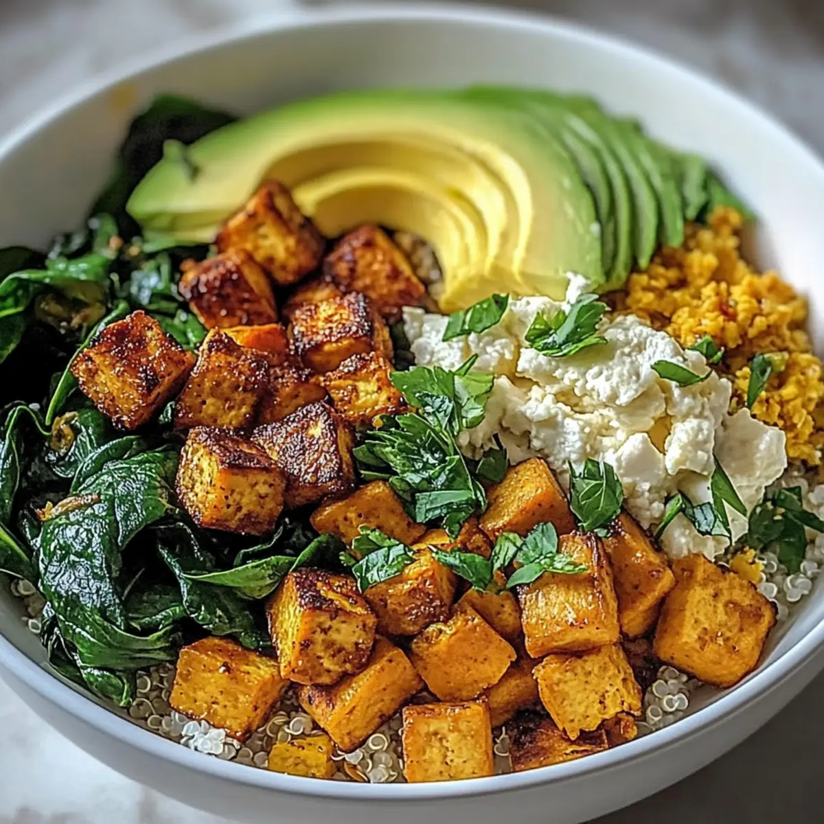 - Distribute quinoa into serving bowls, top with tofu scramble, roasted sweet potatoes, and avocado slices.