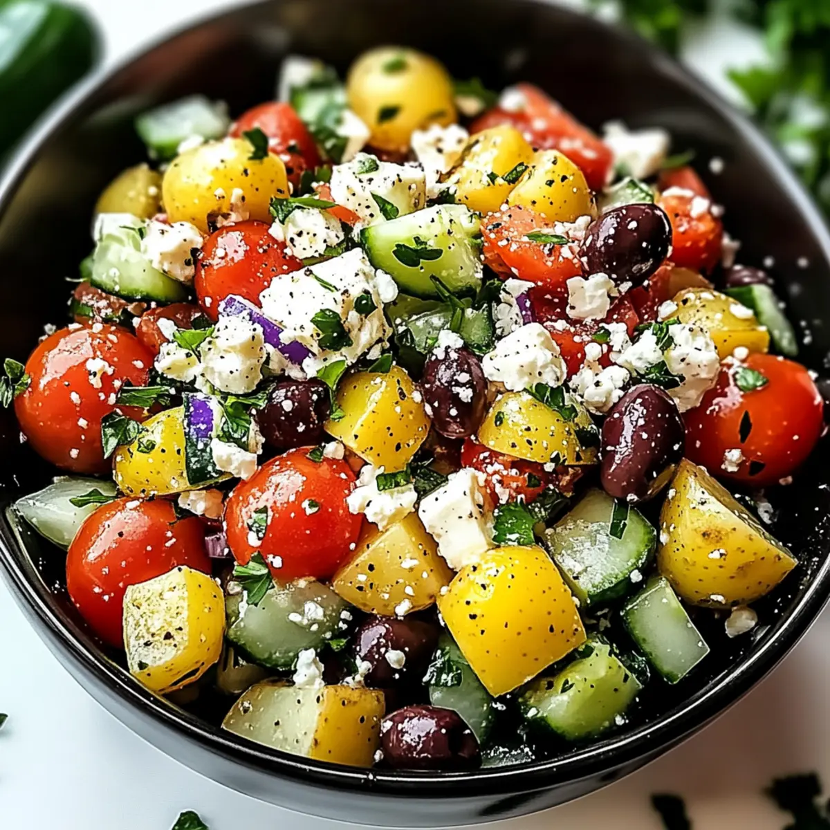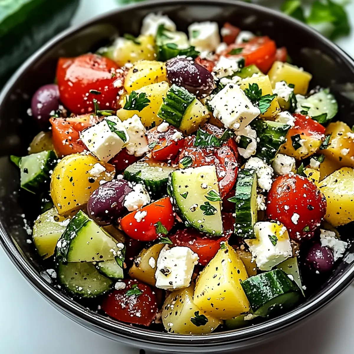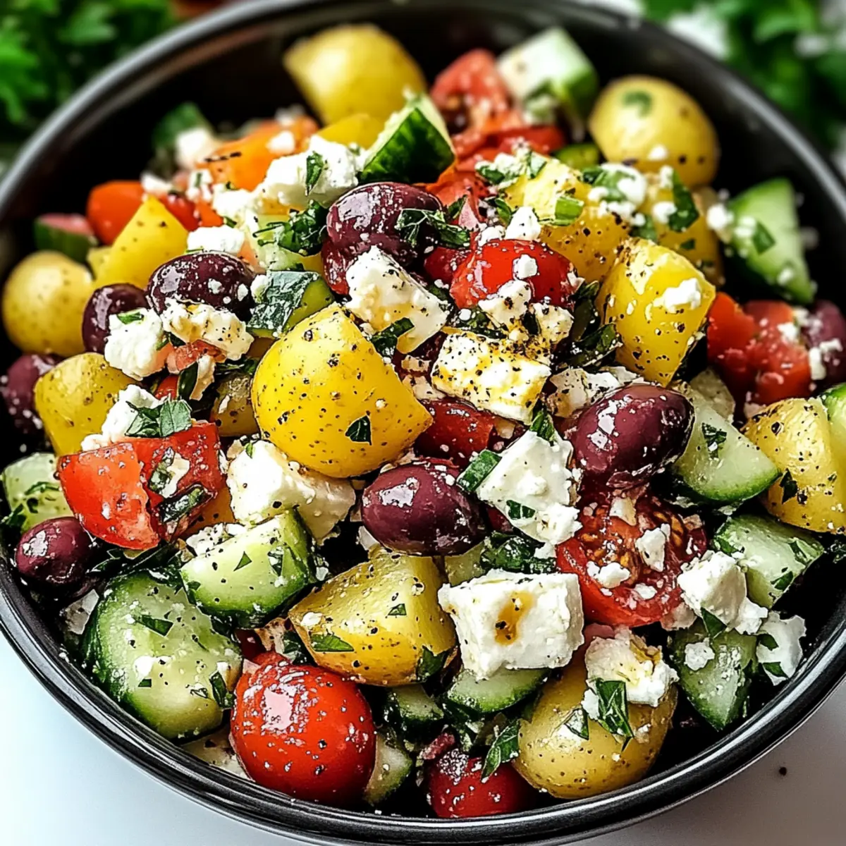 - In a large mixing bowl, combine cubed potatoes with parsley, red onion, cucumber, tomatoes, black olives, and feta cheese. Stir gently.