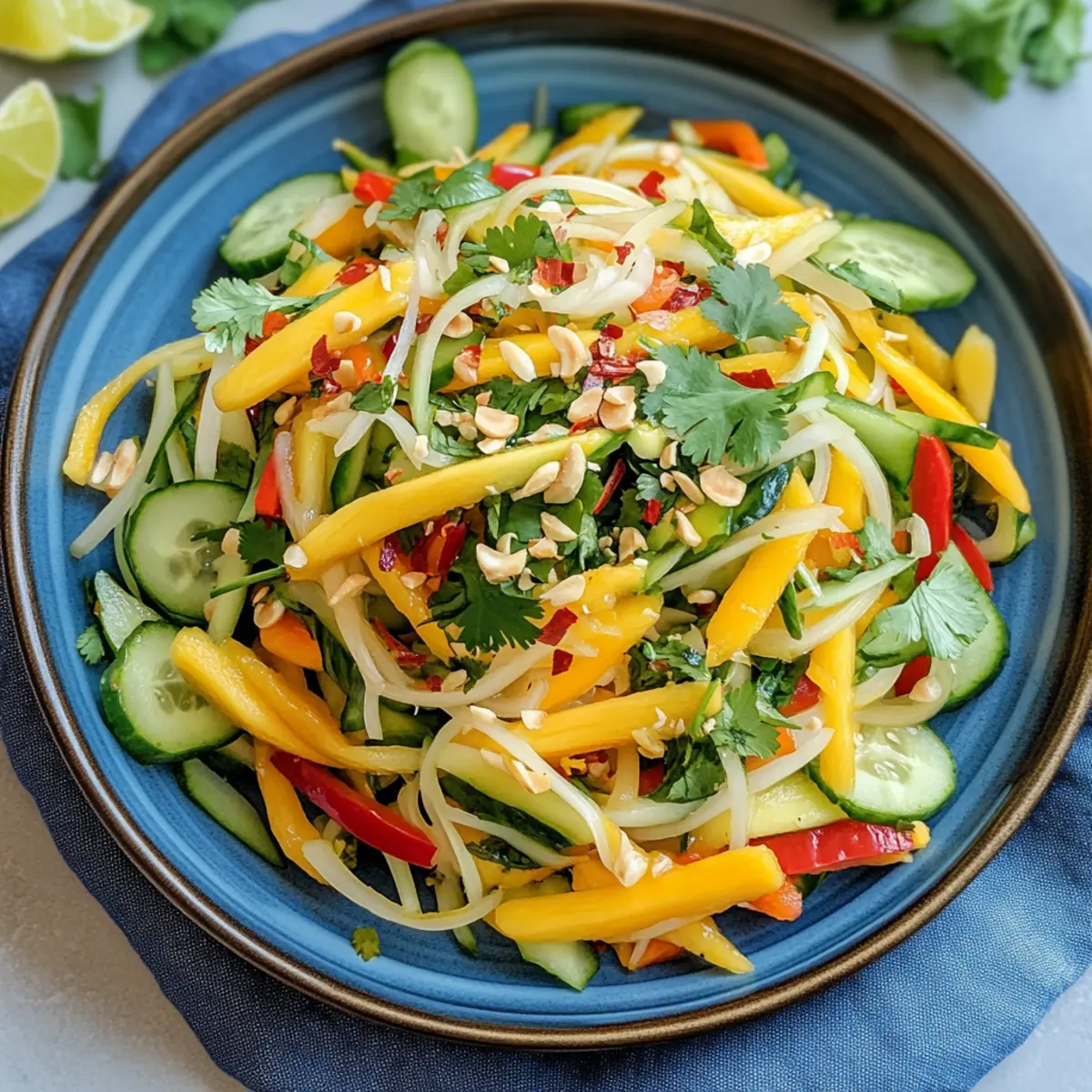 These Vietnamese Mango Salad ingredients are perfect for meal prep, saving you time on busy weeknights! You can prepare all the veggies (mango, cucumber, bell peppers, and carrots) up to 24 hours in advance by washing and slicing them. Store the prepped vegetables in an airtight container in the refrigerator to maintain their freshness and crunch. For the dressing, mix the lime juice and chili flakes, and store it separately to prevent sogginess. When you’re ready to serve, simply combine the prepped ingredients, toss in the dressing, and enjoy a delicious meal with minimal effort. This way, your Vietnamese Mango Salad will be just as vibrant and flavorful as if you’d made it on the spot!